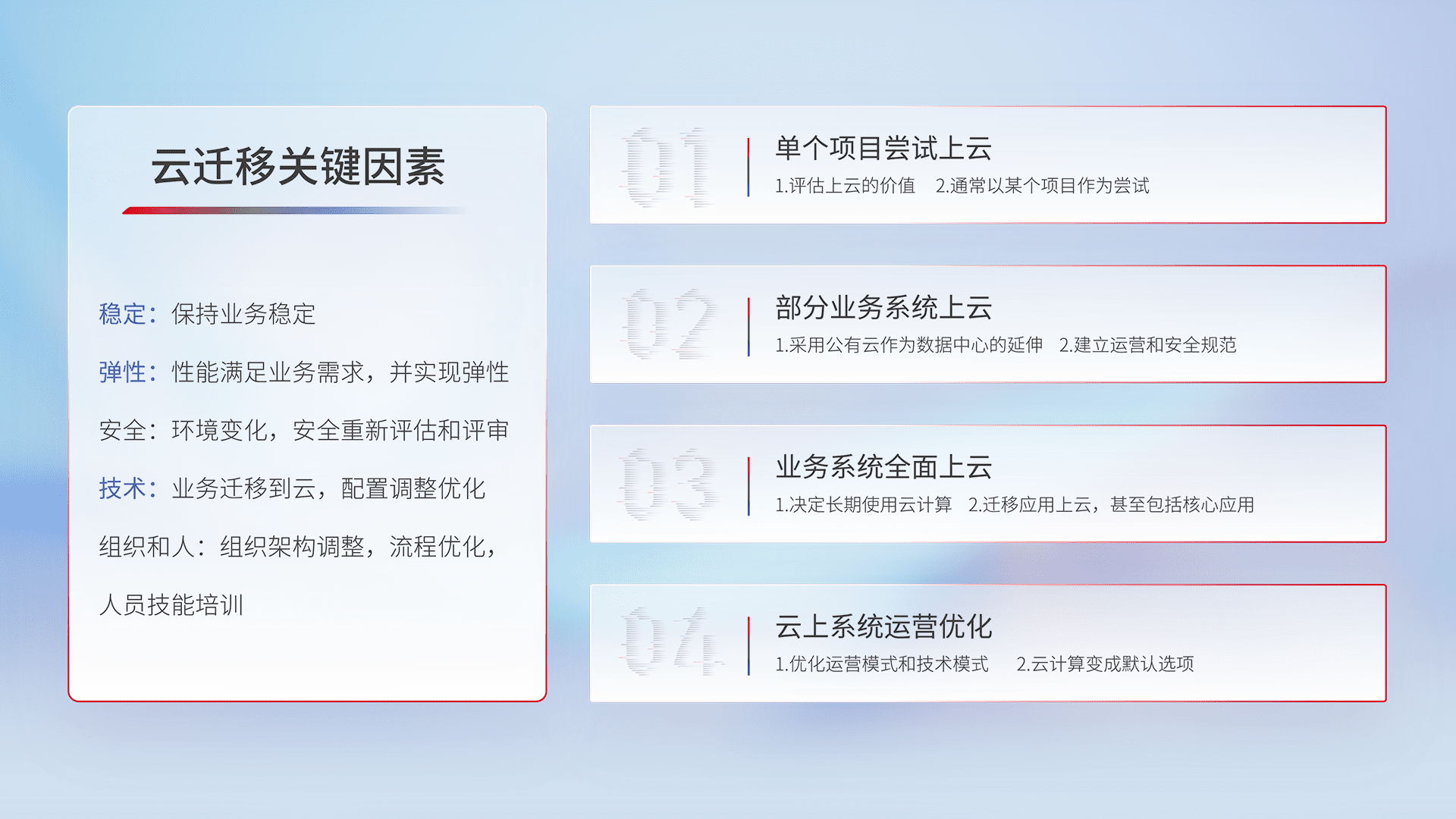 结合实际业务,,从规划设计、、、云平台选型、、云原生改造、、、数据迁移、、集成交付,,,迁移全过程为客户识别最佳上云路径,,,做好风险识别管理,,,设计网络架构、、、身份权限、、、安全审计合规、、操作审计、、、日志审计、、、、监控告警策略、、、多站点容灾设计等,,,对云上基础设施进行整体规划,,,,提升IT治理水平,,,以满足弹性、、、高可用、、、、高性能的需求。。