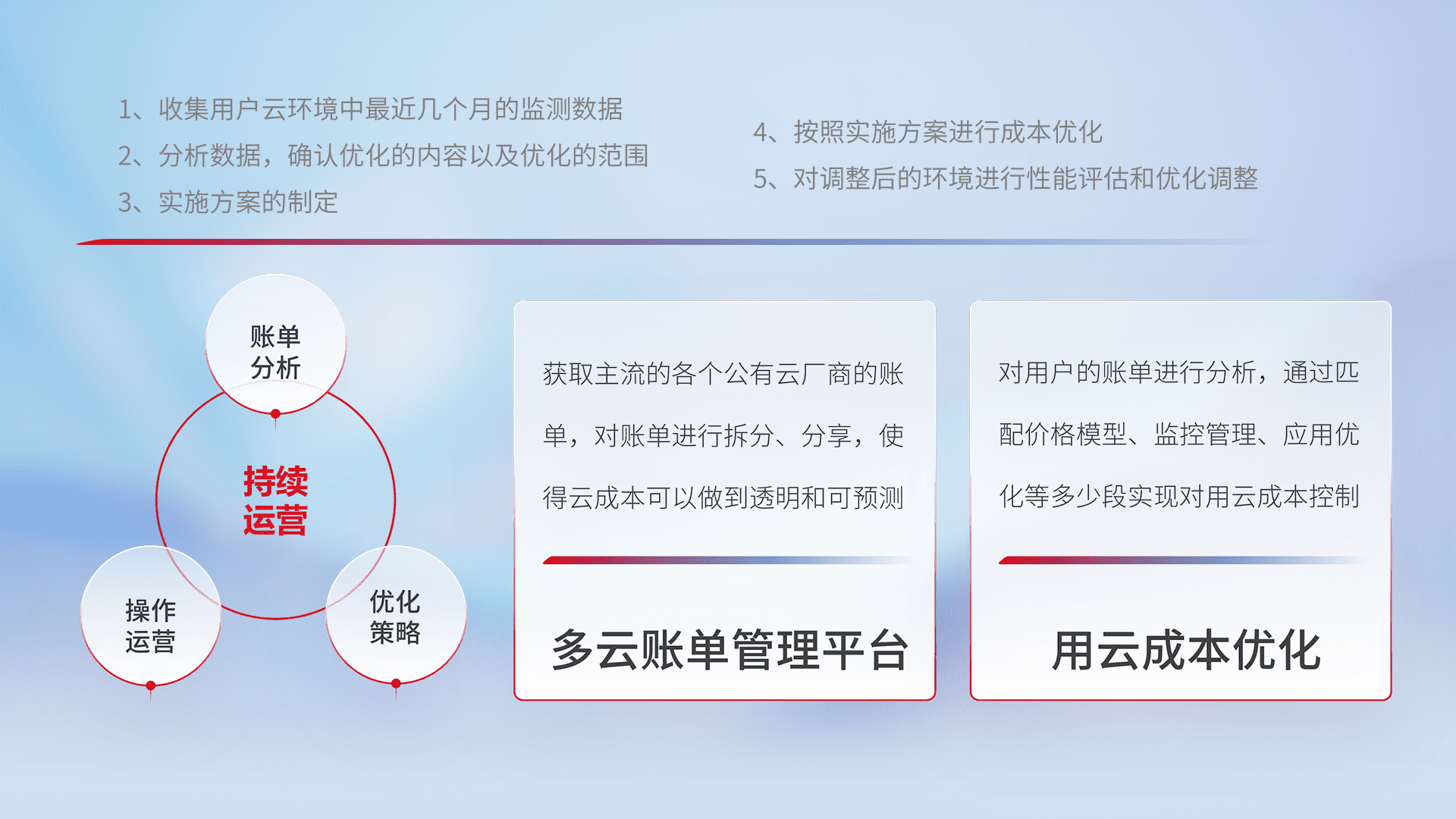 通过多云纳管,,以统一的资源数据模型把客户的云资源进行抽象和封装,,,进而实现对多云资源的统一操作,,,,保障云资源管理的可靠性、、、稳定性与可用性。。。量身定制化运维内容,,,配置、、开发运维、、、补丁管理、、、备份、、监控、、、认证和访问管理、、审计和日常巡检等,,,保障在用云过程中的可靠度,,,,稳定度以及高可用率。。。